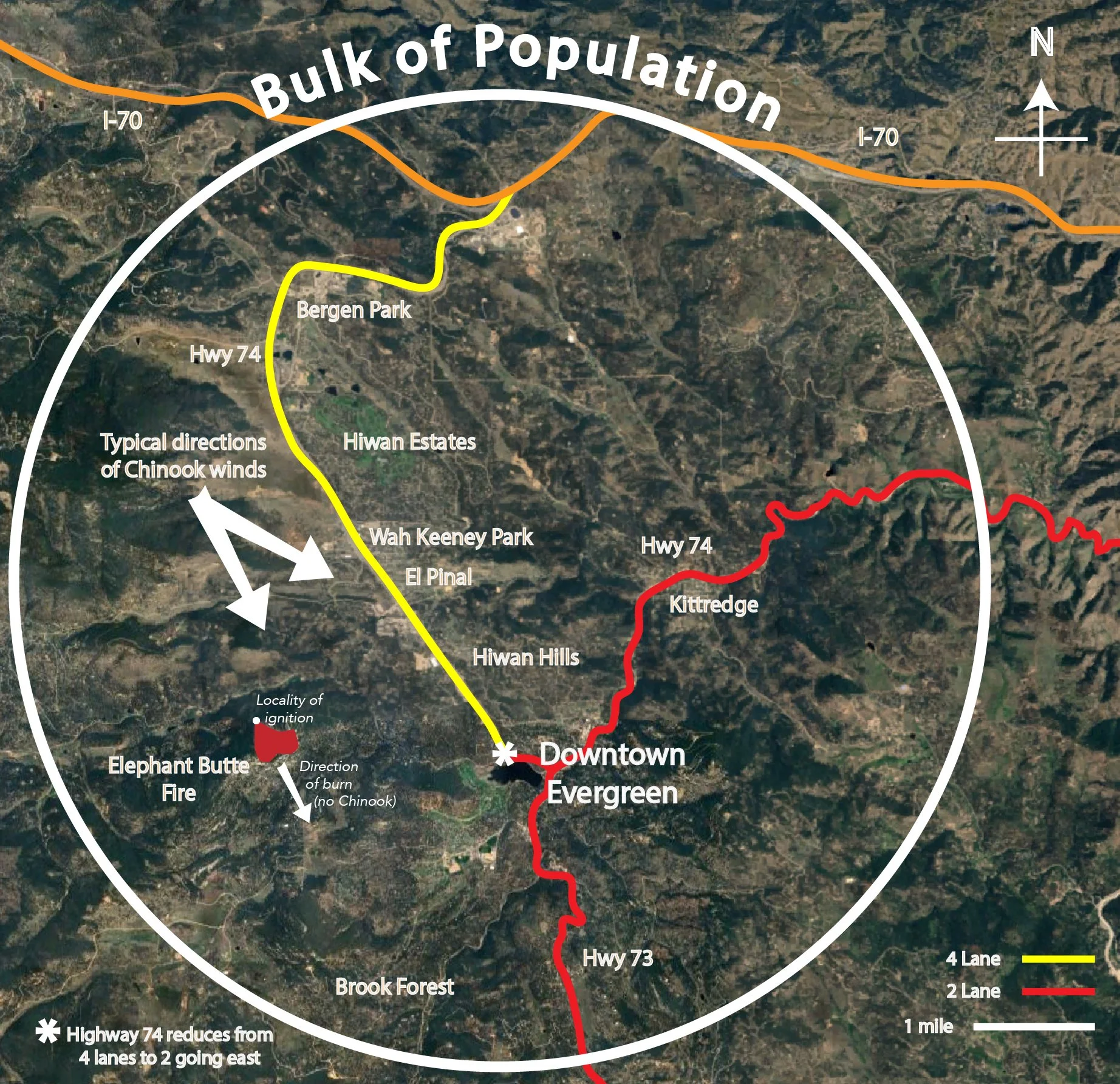 The 2018 California Camp Fire (Pt.3 Wildfire Series) - due to its massive size, speed, and cost in homes and lives - brought forward a somewhat unique problem mountain-terrain communities face; truncated and bottle-necked evacuation routes. For instance, HWY 74 is 4 lanes from I-70 almost to Evergreen Lake, then reduced to 2 lanes. Coming off any direction stemming out east or west is also confined to 2 lanes (HWY 73 to Conifer, 74 to Morrison, and Upper Bear Creek). If traffic backed up north along 74 from the lake, people might be inclined to try Stagecoach Road going east, only to run into a gate securing private property and a winding narrow dirt road.