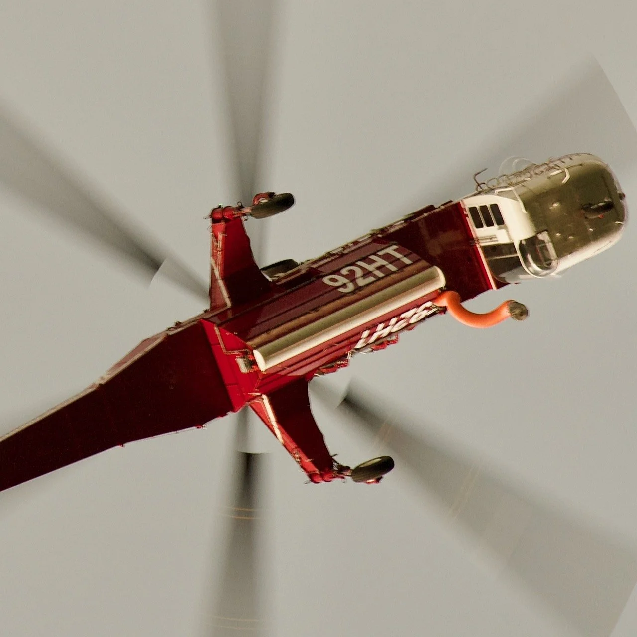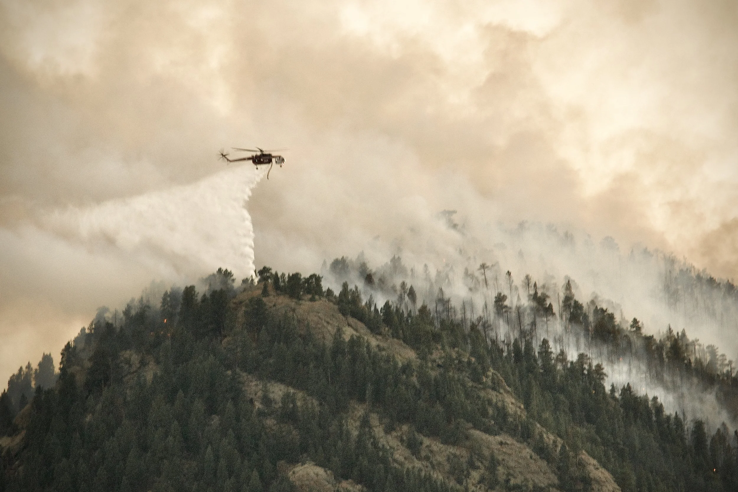 Two Erickson S-64 Helitankers and two small prop planes were used to make more precise drops at the edges of the advancing fire.